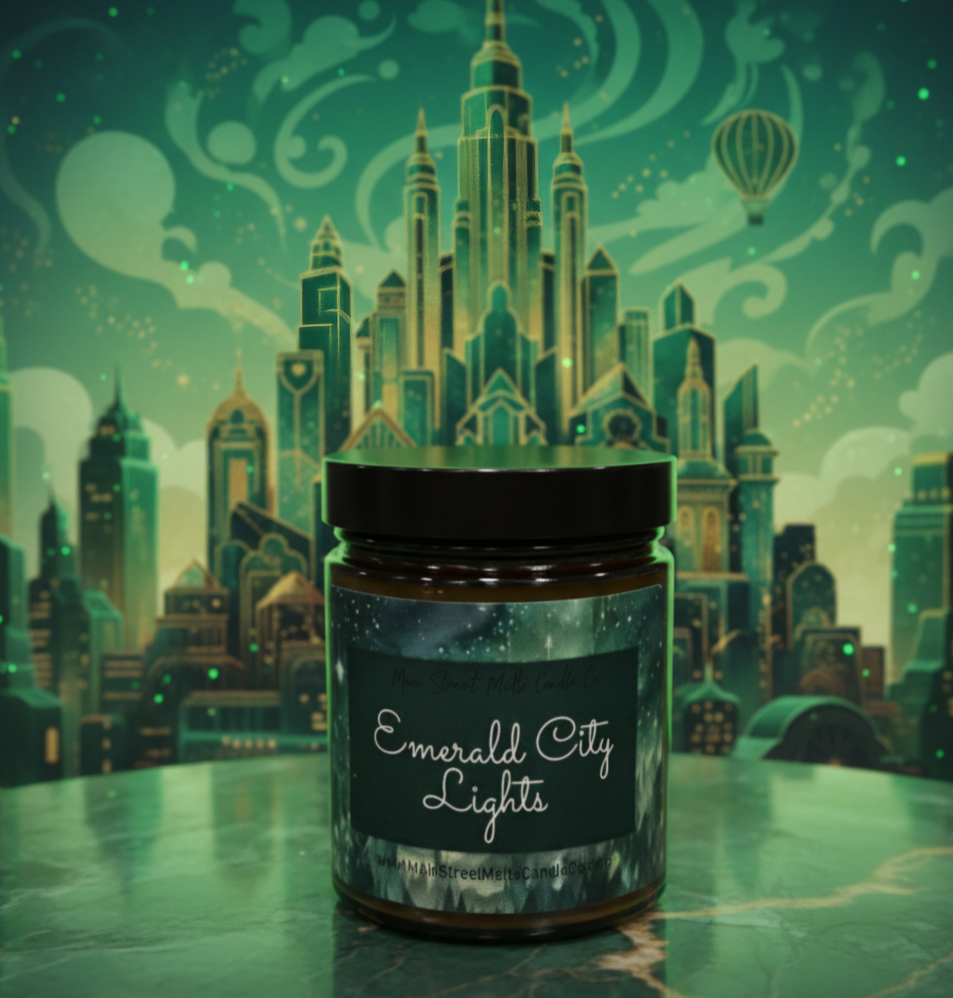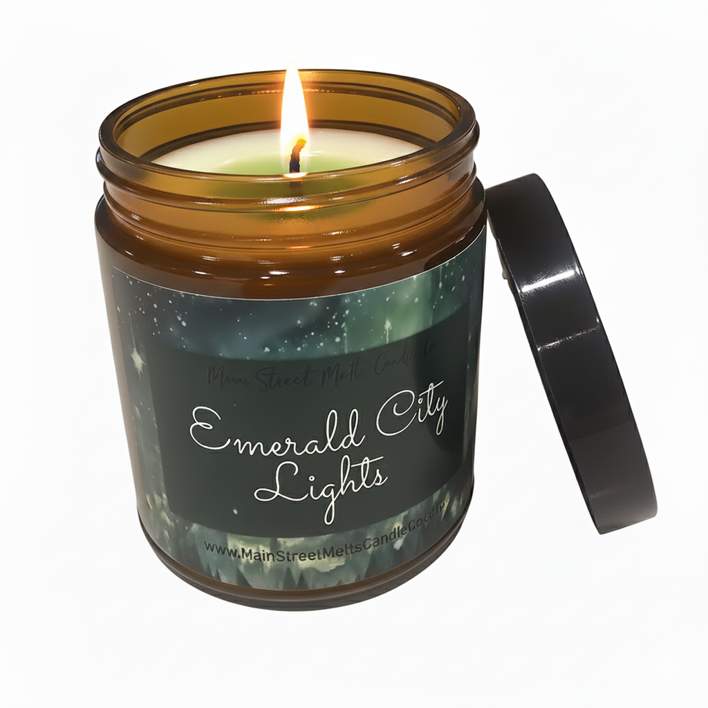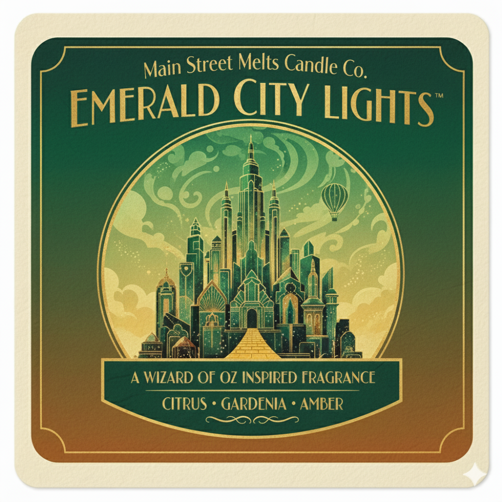 Main Street Melts "Emerald City Lights" captures the moment the gates swing open to reveal the glittering, green heart of Oz. It is a scent of pure wonder—vibrant, luxurious, and magically warm.