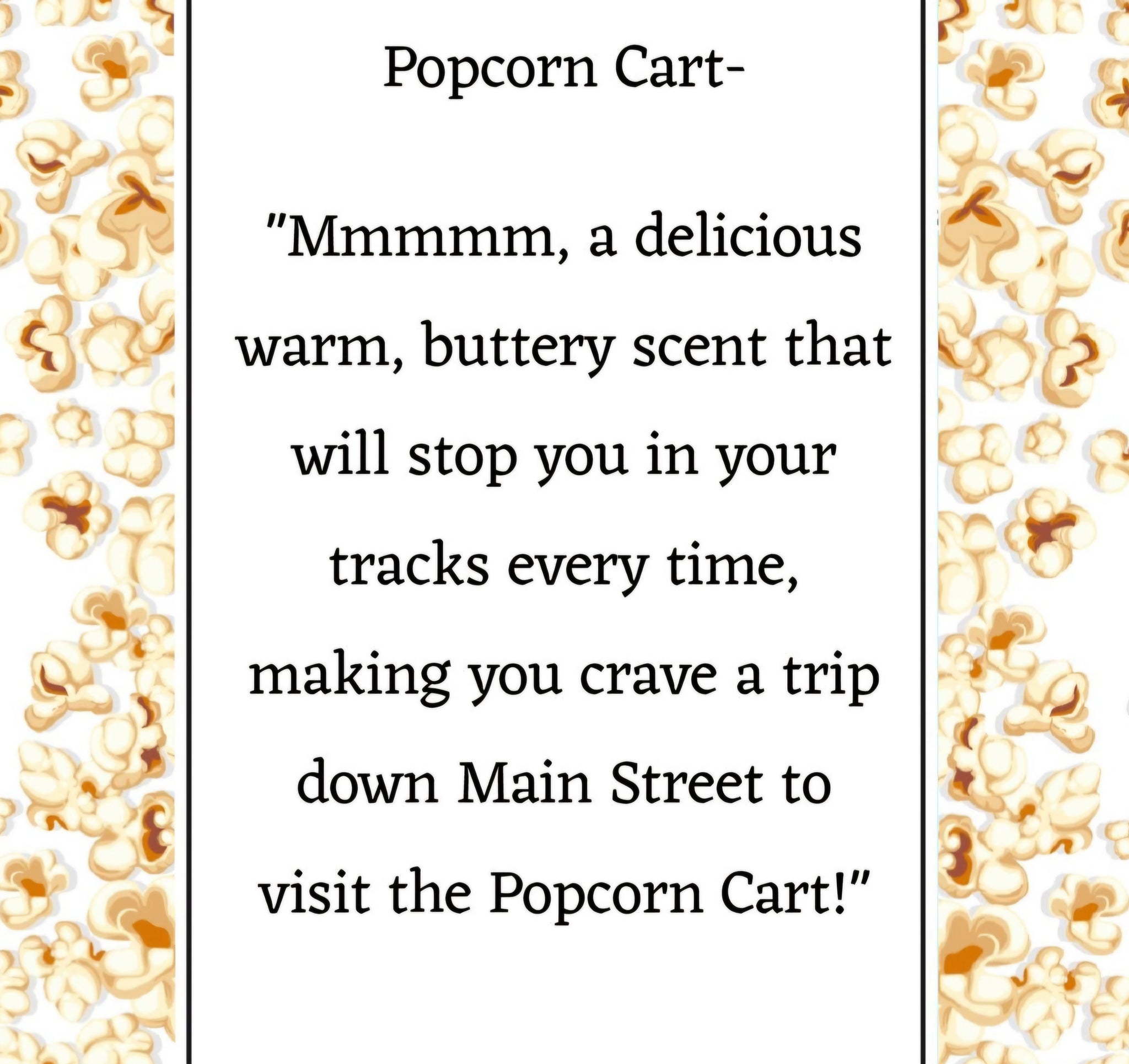 Popcorn Cart- "Mmmmm, a delicious warm buttery scent that will stop you in your tracks every time, making you crave a trip down Main Street to visit the Popcorn Cart!"