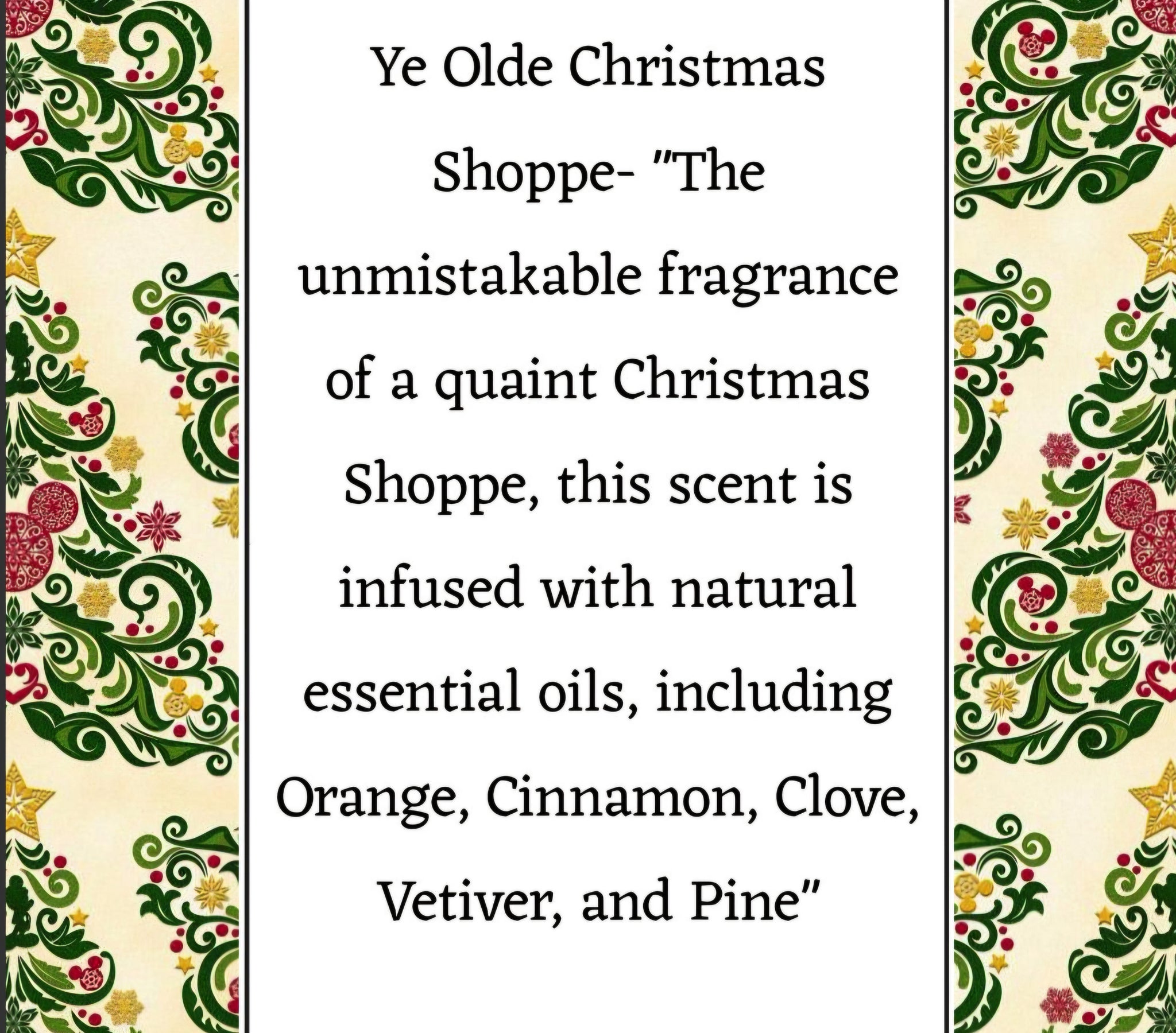 Ye Olde Christmas Shoppe- "The unmistakable fragrance of a quaint Christmas Shoppe, this scent is infused with natural essential oils, including Orange, Cinnamon, Clove, Vetiver, and Pine, Our #1 Best-Selling Holiday fragrance for good reason!"