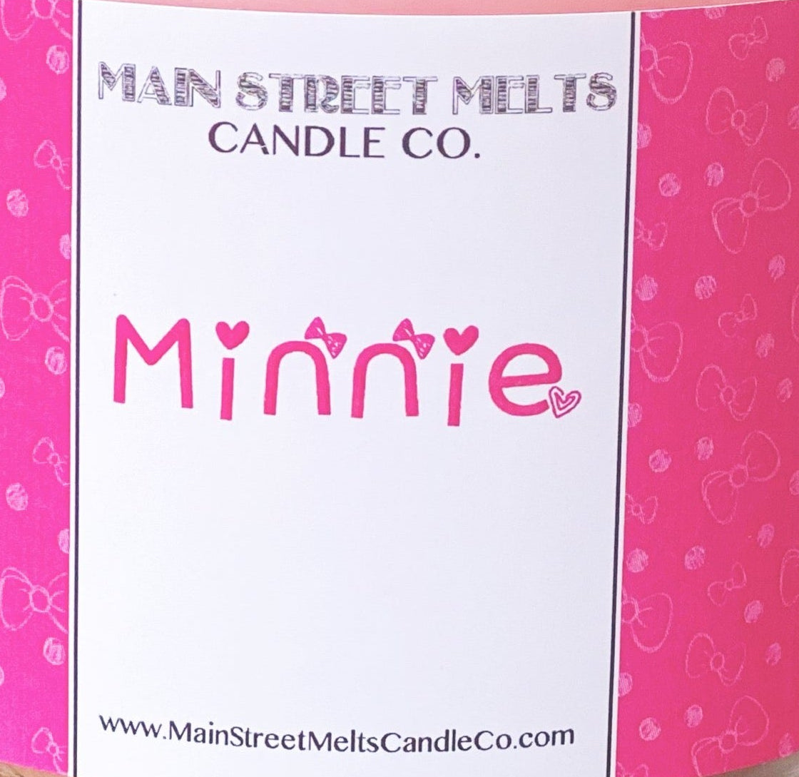 Minnie- "Our Minnie Inspired Candle is sweet, fun, feminine and full of spunk! A beautiful mix of bright berries and citrus, sweet florals and spicy vanilla inspired by our favorite bow-wearing mouse!"